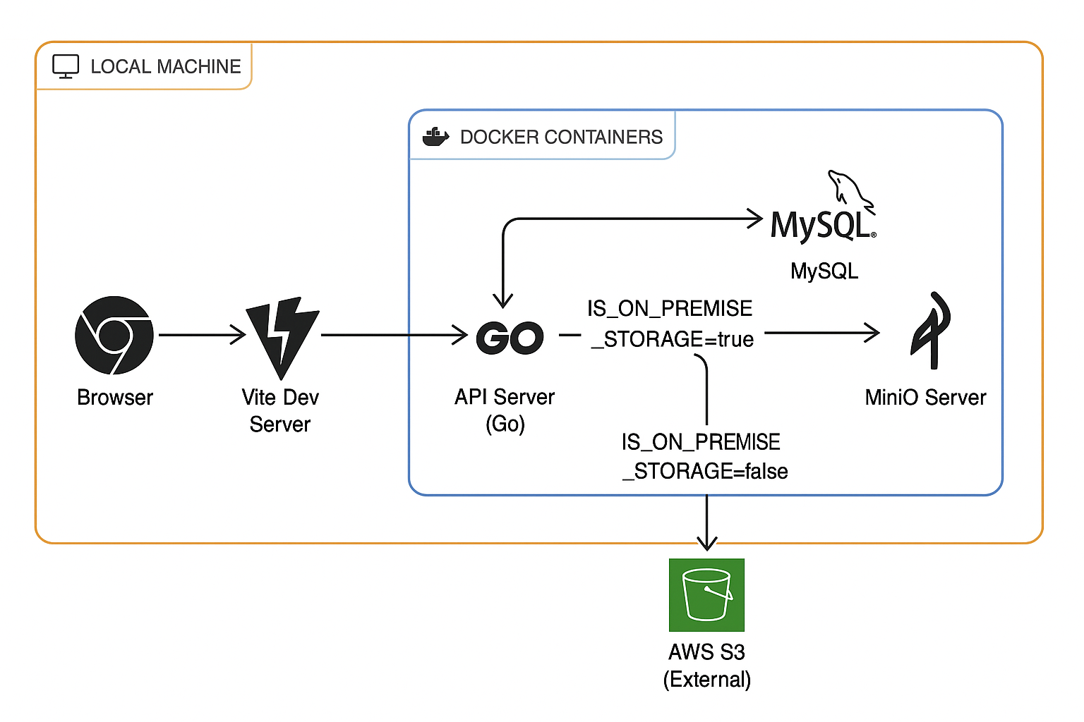 # true: MinIO / false: AWS S3IS_ON_PREMISE_STORAGE=true# 共通のS3互換設定AWS_ACCESS_KEY_ID=your_access_keyAWS_SECRET_ACCESS_KEY=your_secret_keyAWS_REGION=ap-northeast-1S3_BUCKET=sample# MinIO用設定MINIO_ENDPOINT=http://minio:9000MINIO_PRESIGN_ENDPOINT=http://localhost:9000